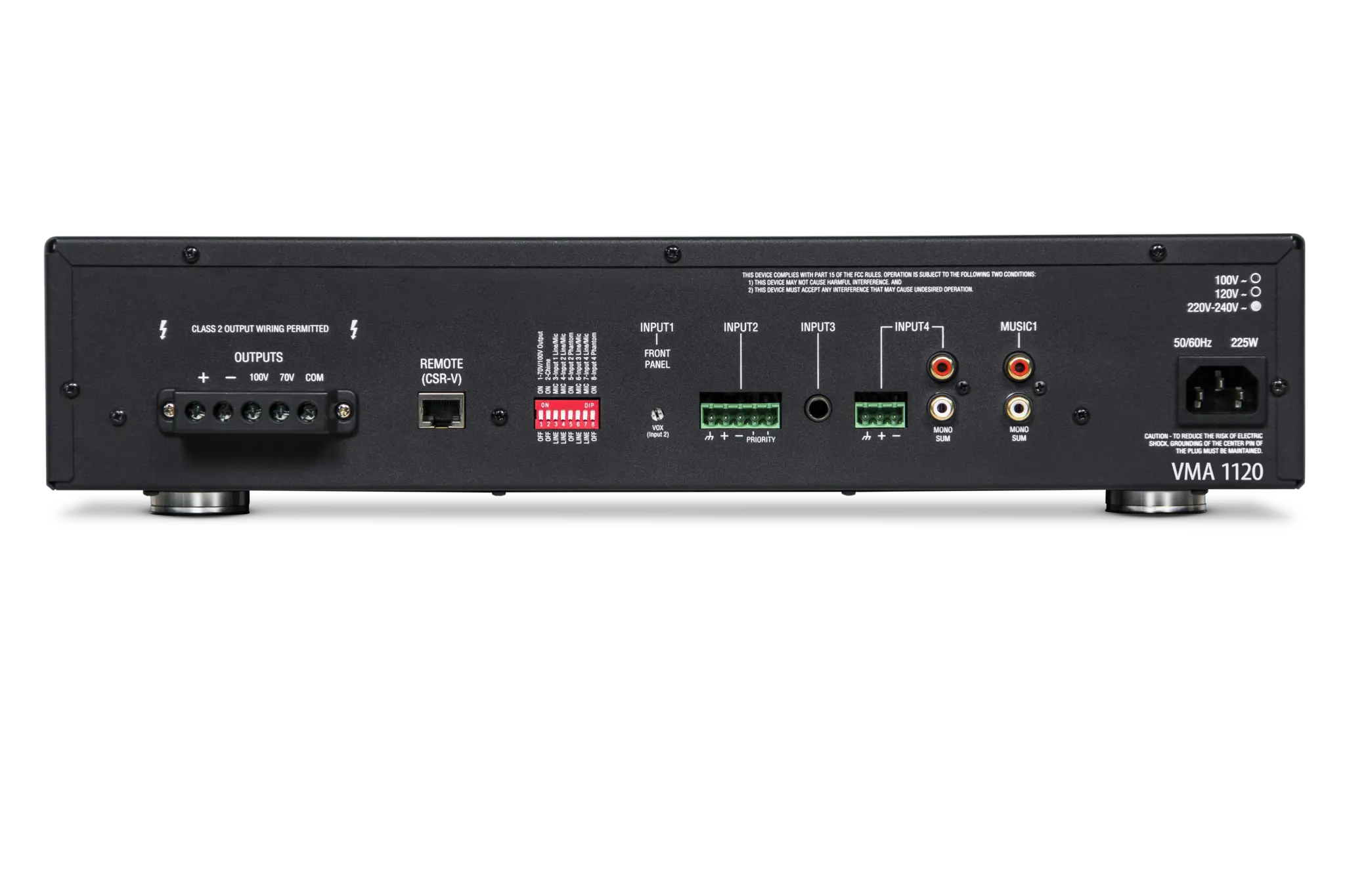 (measured at 2.83VRMS into rated load impedance at any output) 4/8 Ω Output: 20Hz – 20kHz, +/-2dB; 70V/100V Outputs: 80Hz – 15kHz +/-3dB |